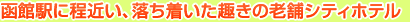 繁華街から一歩入った立地の落ち着きがある老舗ホテル。市電やJR函館駅に程近く、海も徒歩圏内。ホテル内にある和食・洋食・中華の3つの店は、味と価格で地元客の利用も多い。