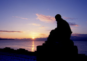 啄木の像と津軽海峡の夕日